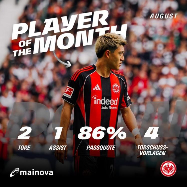 直播吧9月11日讯 法兰克福昨日官方宣布,效力于该队的日本国脚堂安律当选球队8月最佳球员。