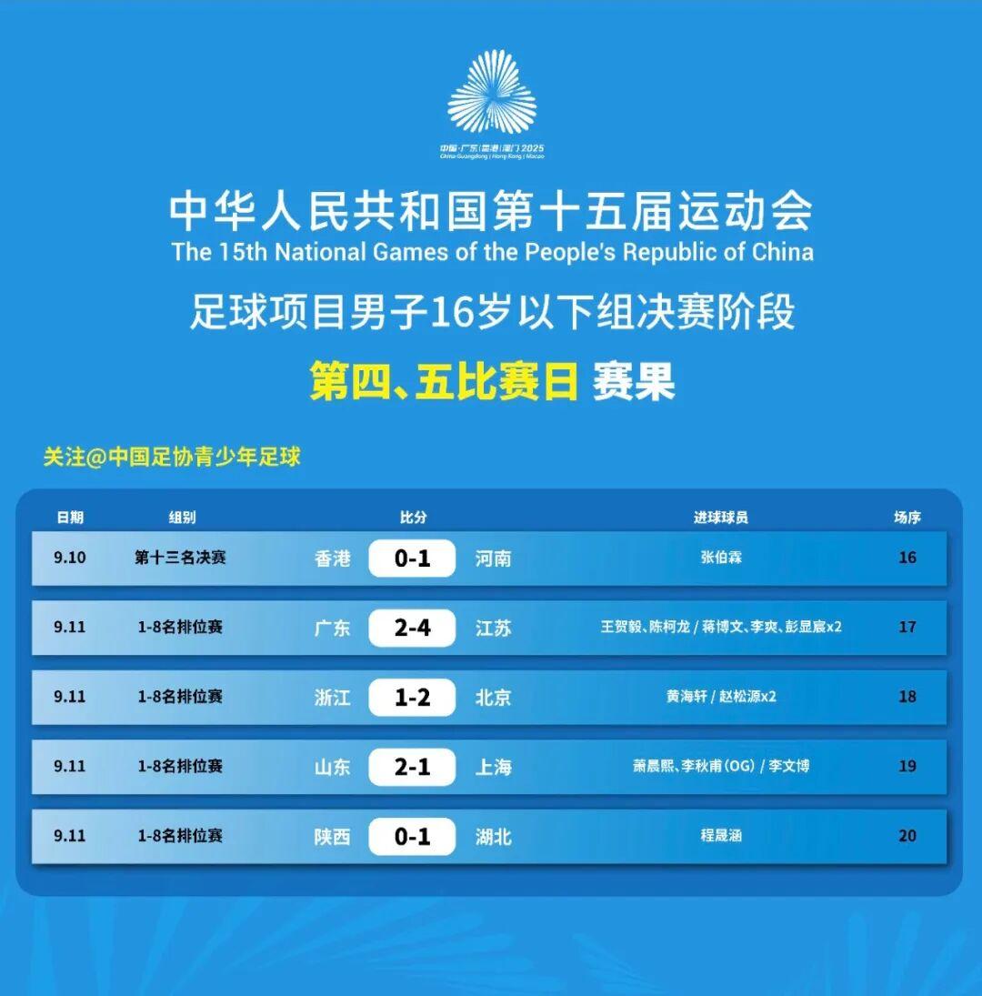 9月11日,中华人民共和国第十五届运动会足球项目男子16岁以下组决赛阶段1/4决赛展开激烈角逐,湖北男足U16队以1-0战胜陕西男足U16队,昂首挺进四强。小组赛阶段,湖北队先后以1比0击败河南队、4比2战胜北京队,凭两连胜锁定D组第一晋级八强;陕西队则0比0逼平浙江队、3比1战胜香港队 后,以1比1战平重庆队,最终位列C组第二跻身淘汰赛。此役,湖北队和陕西...