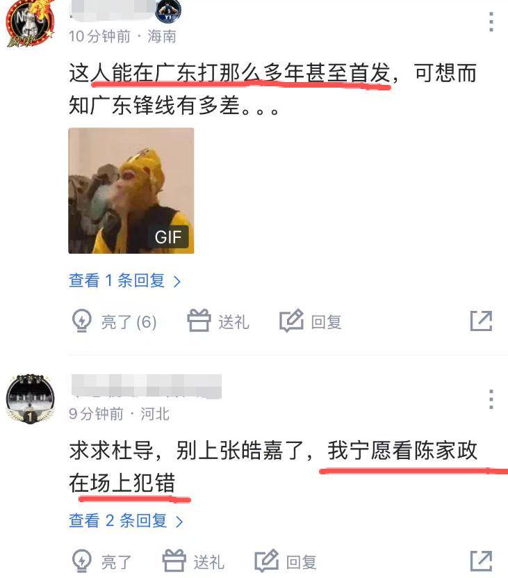在本轮广东以9分险胜天津的比赛中,张皓嘉替补出战14分钟,期间1投0中,只拿到2篮板1助攻,防守端可以说是负作用,进攻端甚至畏惧于出手,这也让不少广东球迷感到唏嘘:“这人能够在广东打那么多年甚至首发,可想而知广东锋线有多差”、“求求杜导,别上张皓嘉了,我宁可看到陈家政在场上犯错。”
